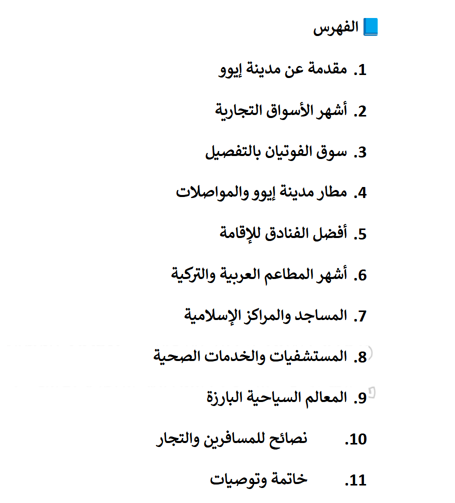 في ايوو يوجد المئات من الأسواق ، الفنادق، المطاعم العربية و الأماكن السياحية لذا جمعناها لكم في 47 صفحة على شكل دليل وباللغة العربية، الإنجليزية والصينية وقمنا بالتفصيل أكثر في أهم سوق وهو سوق الفوتيان وكيفية توزيع التخصصات على كل قسم في سوق الفوتيان كي لا يضيع عليكم الوقت والجهد والمال ، كما جمعنا لكم أهم الأماكن السياحية والمطاعم العربية والفنادق مع المواقع على جوجل وساعات العمل كذلك وضعنا لكم بعض المستشفيات في ايوو .
