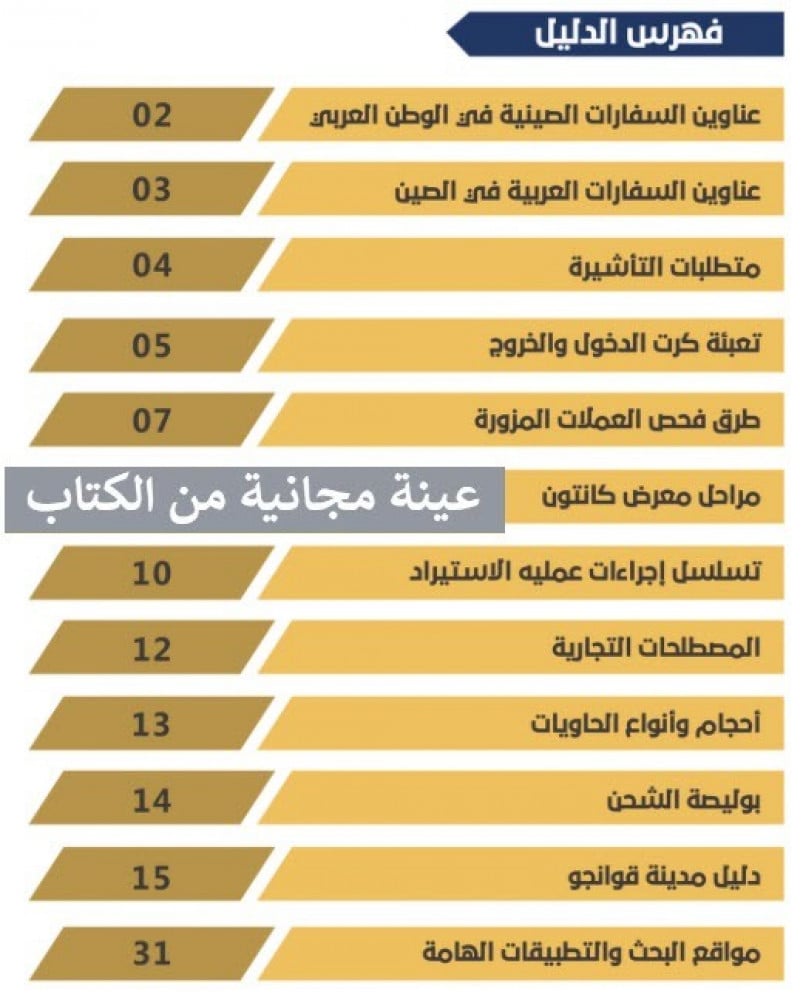 التجارة مع الصين تعتبر تجارة دولية لأنها بين بلدين مختلفين في الثقافة والعملات واللغة وإجراءات الجمارك والنقل البحري والبري والجوي وهكذا ، لذا جمعنا لكم في 32 صفحة على شكل دليل وباللغة العربية، الإنجليزية والصينية وقمنا بالتفصيل أكثر عن عناوين السفارات العربية في الصين مع العناوين باللغة العربية والصينية وأرقام الهواتف ، كذلك السفارات الصينية في الوطن العربي مع العناوين وطرق التواصل ، متطلبات التأشيرة الصينية من السعودية ووكيل التأشيرات الصينية في السعودية مع طرق التواصل ، طرق ملئ كرت الوصول والمغادرة من الصين مع الشرح باللغة العربية ، طرق ملئ كرت الوصول والمغادرة الى هونج كونج ، طريقة معرفة فئة المائة دولار الجديدة ، طريقة معرفة المائة ريمبي الصينية الجديدة ، مراحل معرض كانتون ، إجراءات البيع مع الموردين الصينيين ، مراحل تداول العملية التجارية ، المصطلحات التجارية المستخدمة قبل توقيع العقود التجارية، أحجام وأنواع الحاويات التجارية ، توضيح بعض الأوراق المهمة في الشحن مثل بوليصة الشحن ، معلومات مهمة عن جوانزو مثل أهم الأماكن السياحية والأسواق التجارية بالعربي والصيني والإنجليزي ، خريطة مترو جوانزو ، أسواق جوانزو بالعربي والإنجليزي ، قائمة بالمولات التجارية في جوانزو ، مساجد حوانزو ، عناوين المستشفيات في جوانزو ، محطات القطار في جوانزو ، عناوين أهم شركات الطيران في جوانزو مثل السعودية والامارتية وغيرها ، القائمة الجديدة بالمواد المصرحة والممنوعة في الطائرة ، أشهر الفنادق في جوانزو ، ملاهي شيملونج ، اهم المعالم السياحية المهمة ، مواقع وتطبيقات مهمة لكل من يزور الصين ، لذا كي لا يضيع عليكم الوقت والجهد والمال ، جمعنا لكم كل هذه المعلومات في هذا الدليل .