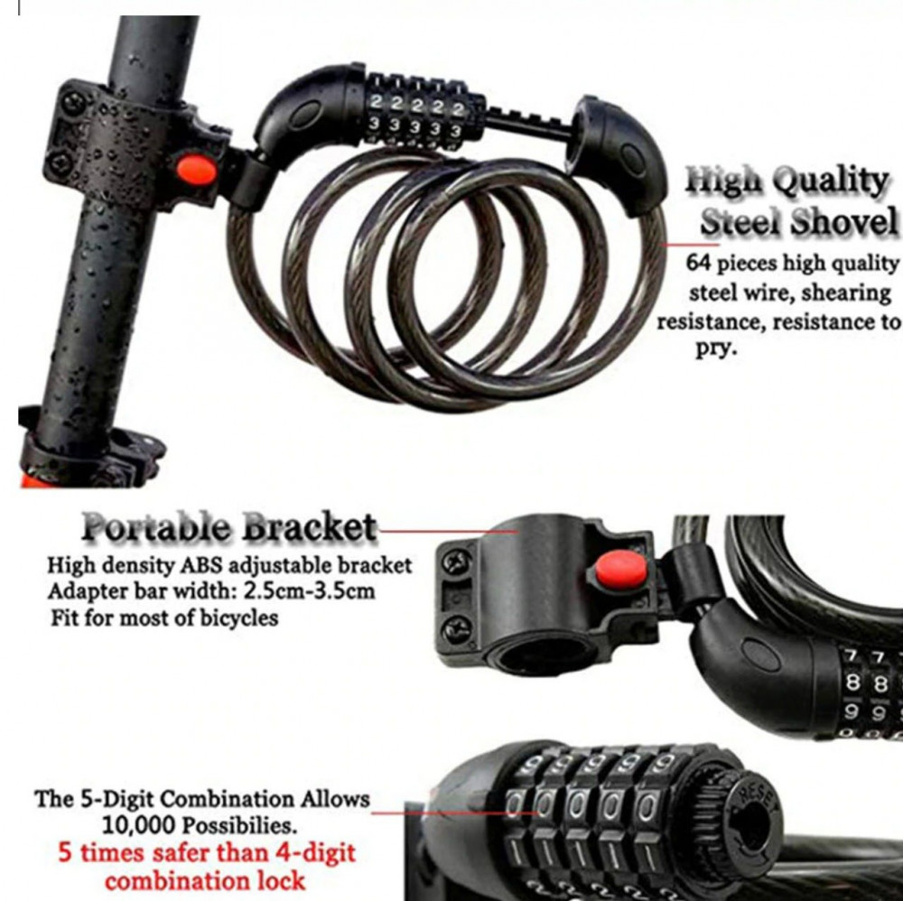 Bike Lock 5 Digit Code Combination Bicycle Security Lock - قفل الدراجات الهوائية والنارية من ستانلس ستيل المغطي بالبلاستيك القوي والرقم السري