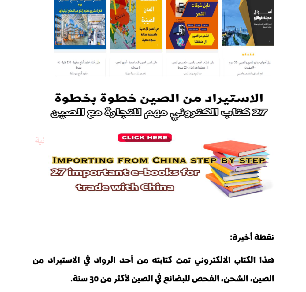 هذا الكتاب الالكتروني تمت كتابته من أحد الرواد في الاستيراد من الصين، الشحن، الفحص للبضائع في الصين لأكثر من 30 سنة.