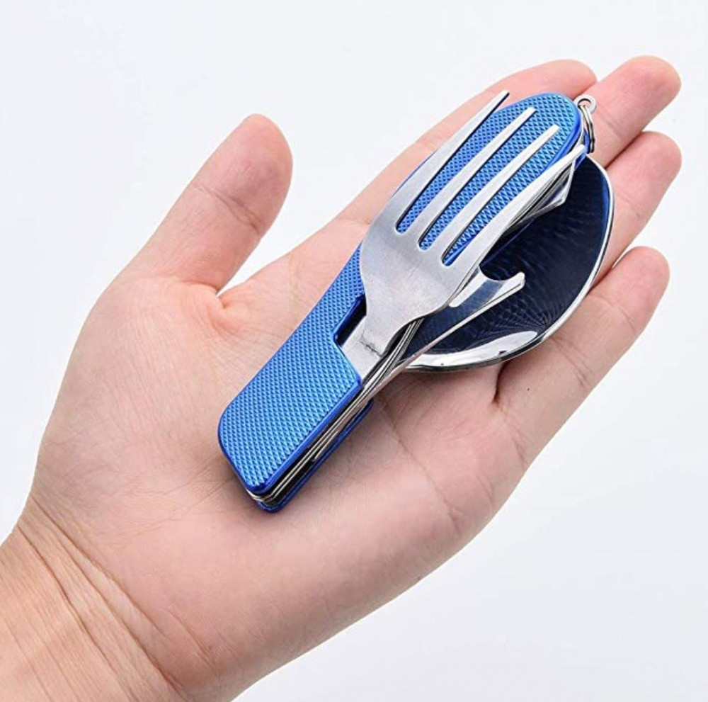 4 IN 1 FULL SIZED UTENSIL – Detachable fork, spoon, knife and bottle opener. Ability to use the fork in one hand while using the spoon/knife in the other.